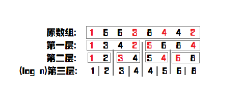 注意:为了编程实现方便,本文依照位置的中间值将大数组划分为两个小数组,即下文中的划分树相当于是归并排序的过程,而非快速排序的过程。最顶层的大数组为有序数组,最底层为原数组。