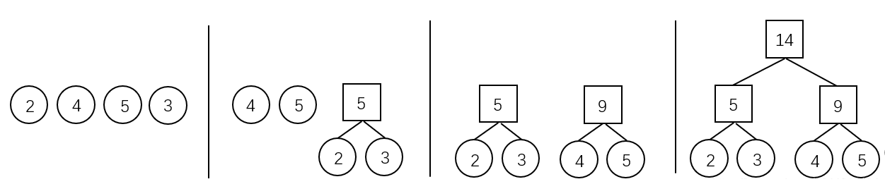 - 删除与加入:从 \(F\) 中删除作为左、右子树的两棵二叉树,并将新建立的二叉树加入到 \(F\) 中。