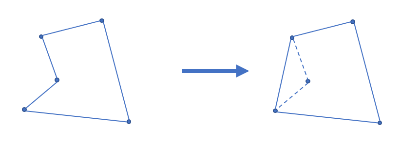 凸包用最小的周长围住了给定的所有点。如果一个凹多边形围住了所有的点,它的周长一定不是最小,如下图。根据三角不等式,凸多边形在周长上一定是最优的。