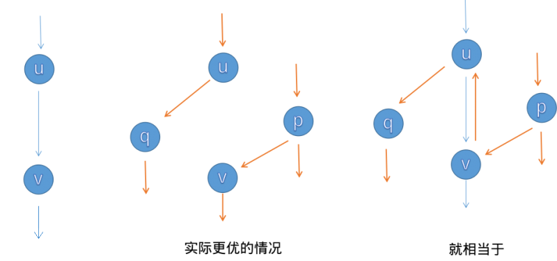- 现在引入退流操作。第一次增广后,退流意味着 \(c_f(v, u)\) 增加了 \(1\) 剩余容量,即相当于新增 \((v, u)\) 这条边,因此我们可以再进行一次先后经过 \(p, v, u, q\) 的增广(如右图橙色路径所示)。无向边 \((u, v)\) 上的流量在两次增广中抵消,我们惊奇地发现两次增广叠加得到的结果实际上和中图是等价的。