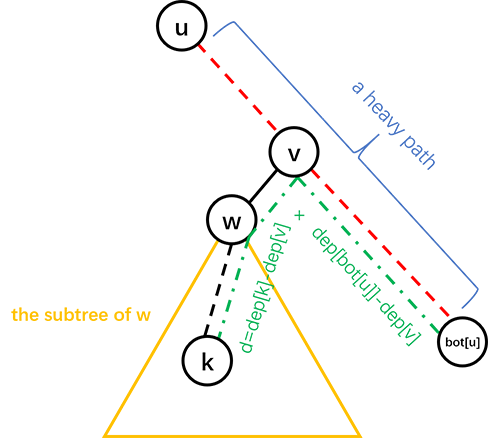 根据长链剖分的性质,\(k-2^i \le 2^i \leq d\) , 也就是说,我们可以 \(O(1)\) 在这条重链的表格上求出的这个节点的 \(k\) 级祖先。