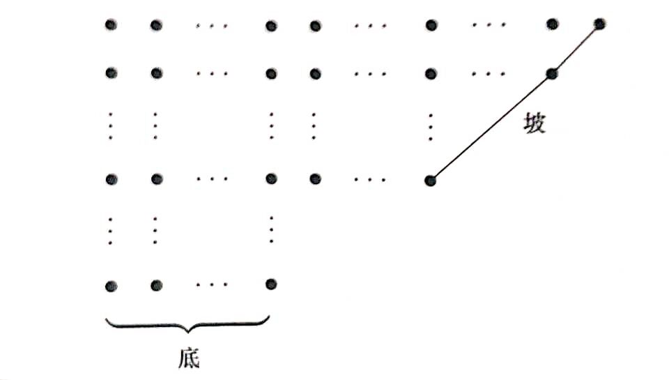 画出每个互异分拆的 Ferrers 图。最后一行称为这个图的底,底上点的个数记为 \(b\)(Bottom);连接最上面一行的最后一个点与图中某点的最长 \(45\) 度角线段,称为这个图的坡,坡上点的个数记为 \(s\)(Slide)。